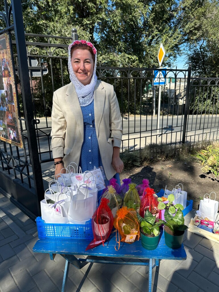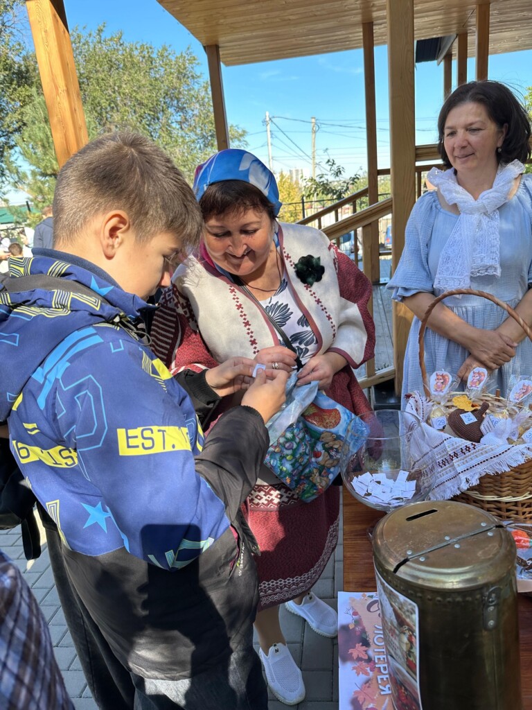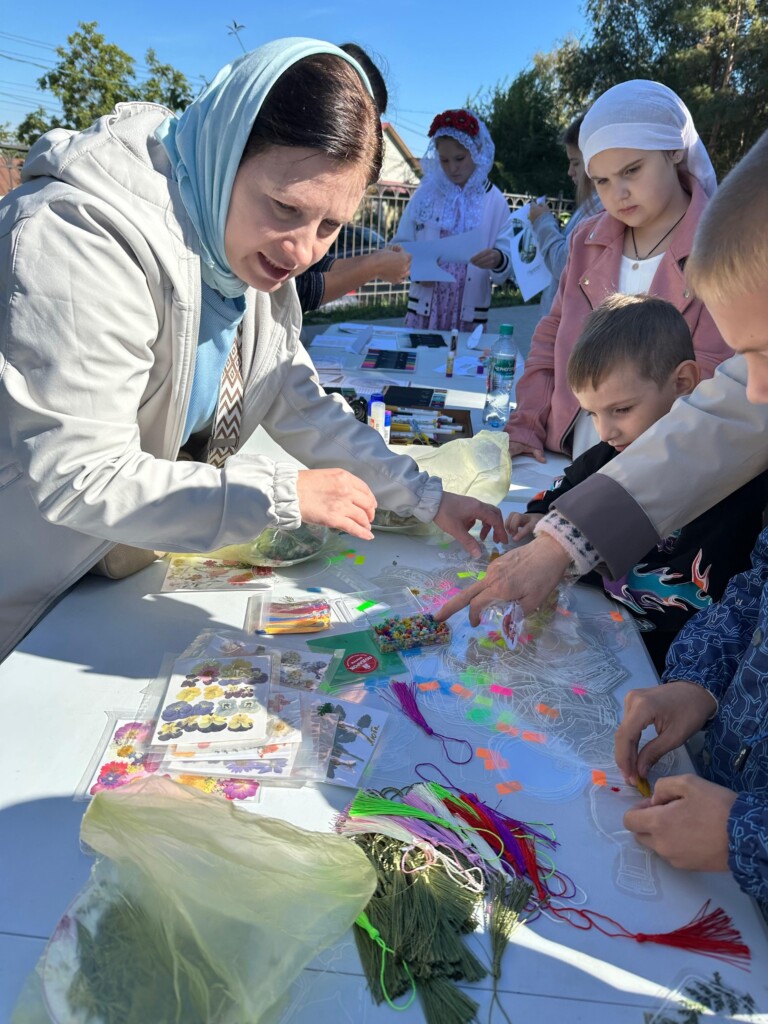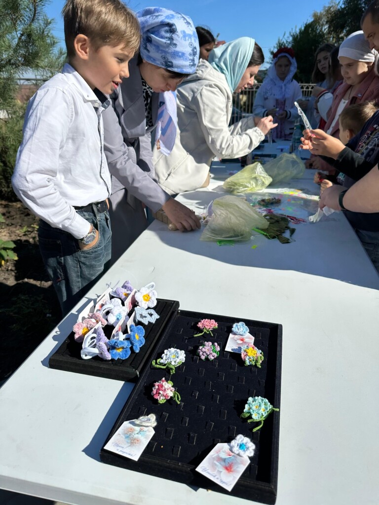 Усилиями прихожан приготовили вкусный плов и выпечку, организовали фотозону с арбузами, всевозможные тематические локации: фотоальбом жизни прихода, который можно было посмотреть и оставить свои впечатления; стол-выставка ножей от пономаря Максима; продажа сортовых фиалок и броши ручной работы (средства от продажи идут на деятельность воскресной школы); осенняя лотерея вызвала у всех самый большой интерес, покупая билетик можно было выиграть от картофеля до живописной картины; мастер классы: лозоплетения, от взрослого до ребёнка хотели научиться плести из лозы мини корзинки и карандашницы, а так же дети консервировали лето-сухоцветы в баночки-закладки и делали интересную открытку в виде жёлудя с белочкой.