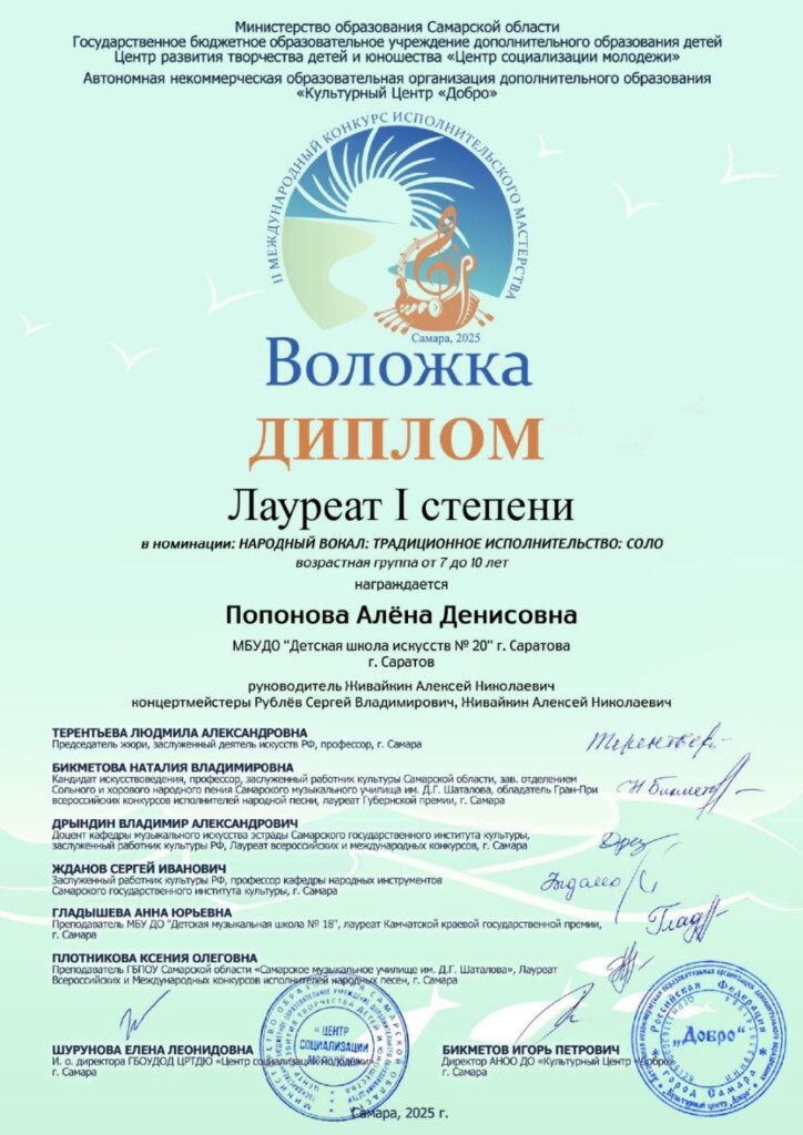 Поздравляем воспитанницу нашей воскресной школы Попонову Алёну с победой в международном конкурсе исполнительского мастерства — ЛАУРЕАТ 1 СТЕПЕНИ!!!