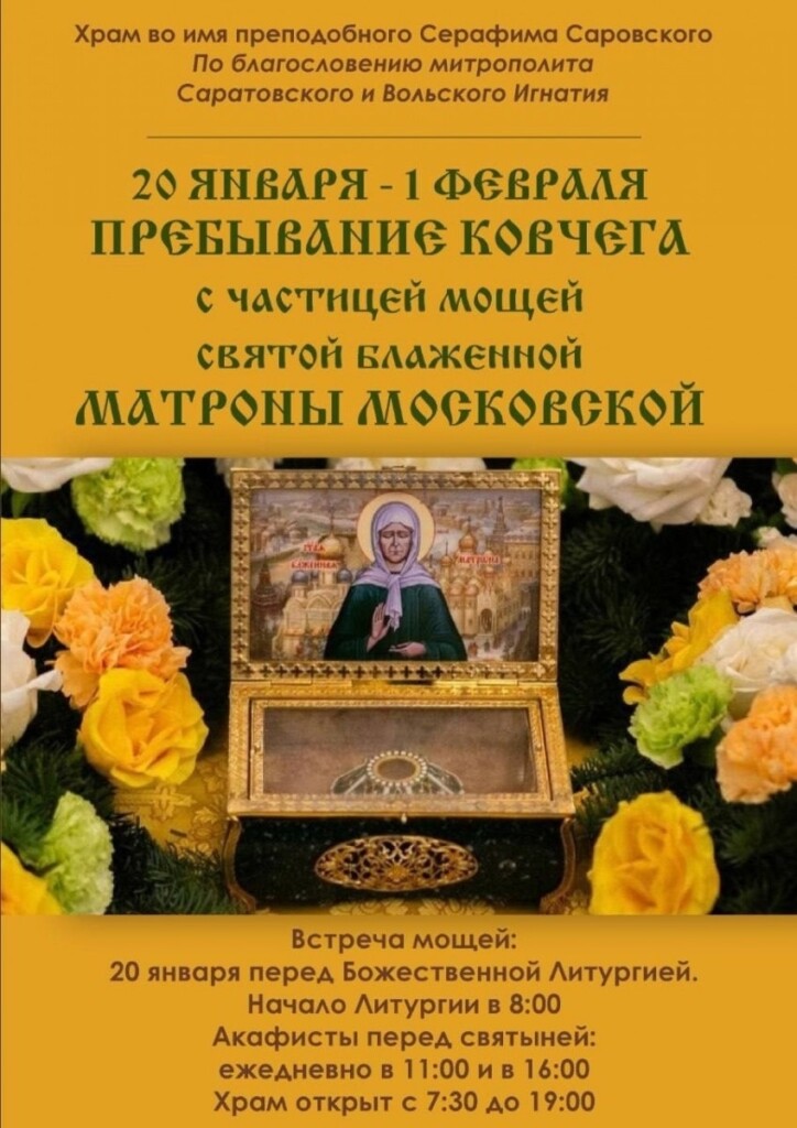 С 20 января по 1 февраля включительно в храме во имя преподобного Серафима Саровского г. Саратова будет пребывать ковчег с частицей мощей святой блаженной Матроны Московской.