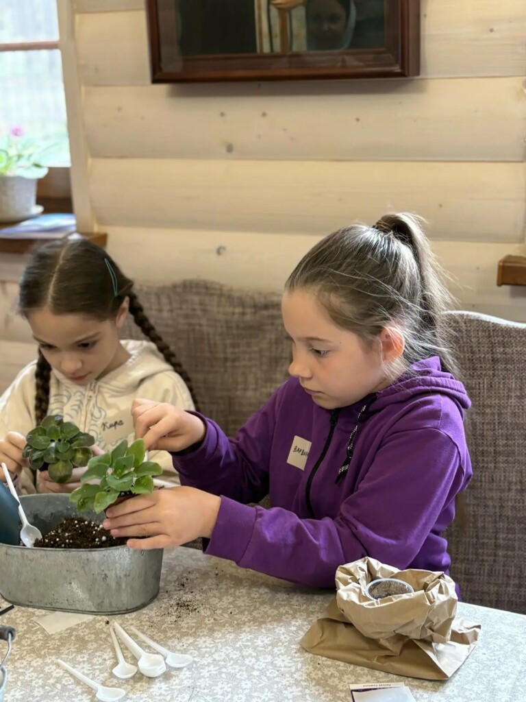 Каждый участник получил свою розеточку фиалки, выбрав сорт — у каждого был свой неповторимый цвет. Под руководством нашей гостьи девочки бережно посадили фиалку в горшочек.