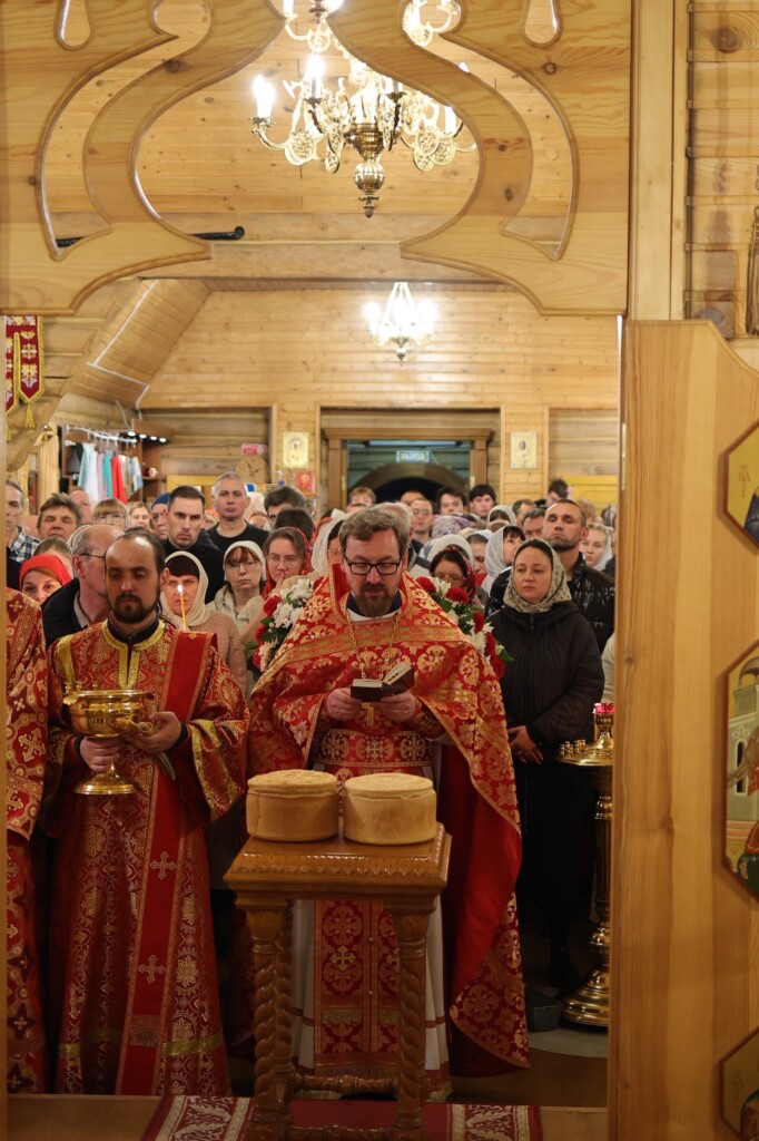 По заамвонной молитве освятили артос, который будет находиться всю Светлую седмицу на солее, участвовать в крестных ходах на светлой седмице и затем будет роздан людям в воскресенье.