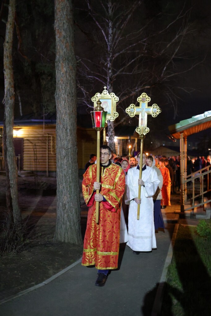В полночь состоялся крестный ход, по его завершении перед закрытыми вратами храма прозвучало Пасхальное приветствие «Христос Воскресе! »