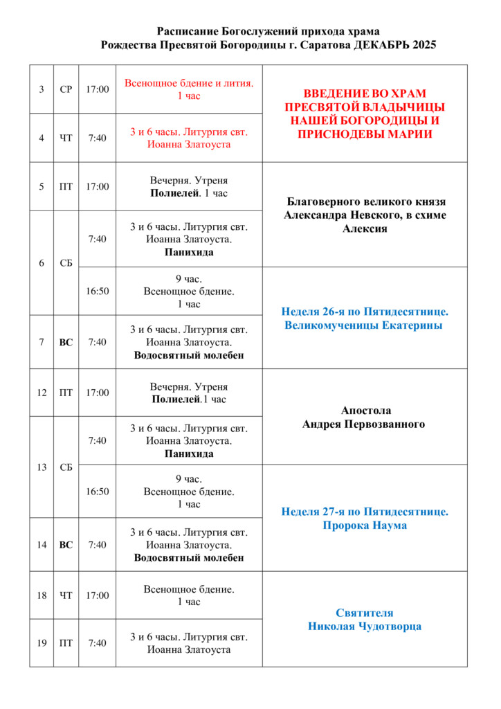 6 декабря 202523 ноября 2025 (по ст.ст.)СубботаСедмица 26-я по ПятидесятницеПреподобномученик Серафим (Тьевар), монахСвятитель Амфилохий, епископ ИконийскийСвятитель Григорий, епископ АкрагантийскийМученик Сисиний Кизический, епископМученик Феодор АнтиохийскийИсповедник Иоанн ВасильевБлаговерный князь Александр (в схиме Алексий) НевскийСвятитель Митрофан (в схиме Макарий), епископ ВоронежскийПреподобный Колумбан Люксейский, игуменМученик Александр УксусовСвященномученик Елеазар Спиридонов, пресвитерМф.11:27–30, Гал.5:22–6:2, Мф.11:27–30, Гал.3:8–12, Лк.10:19–21-